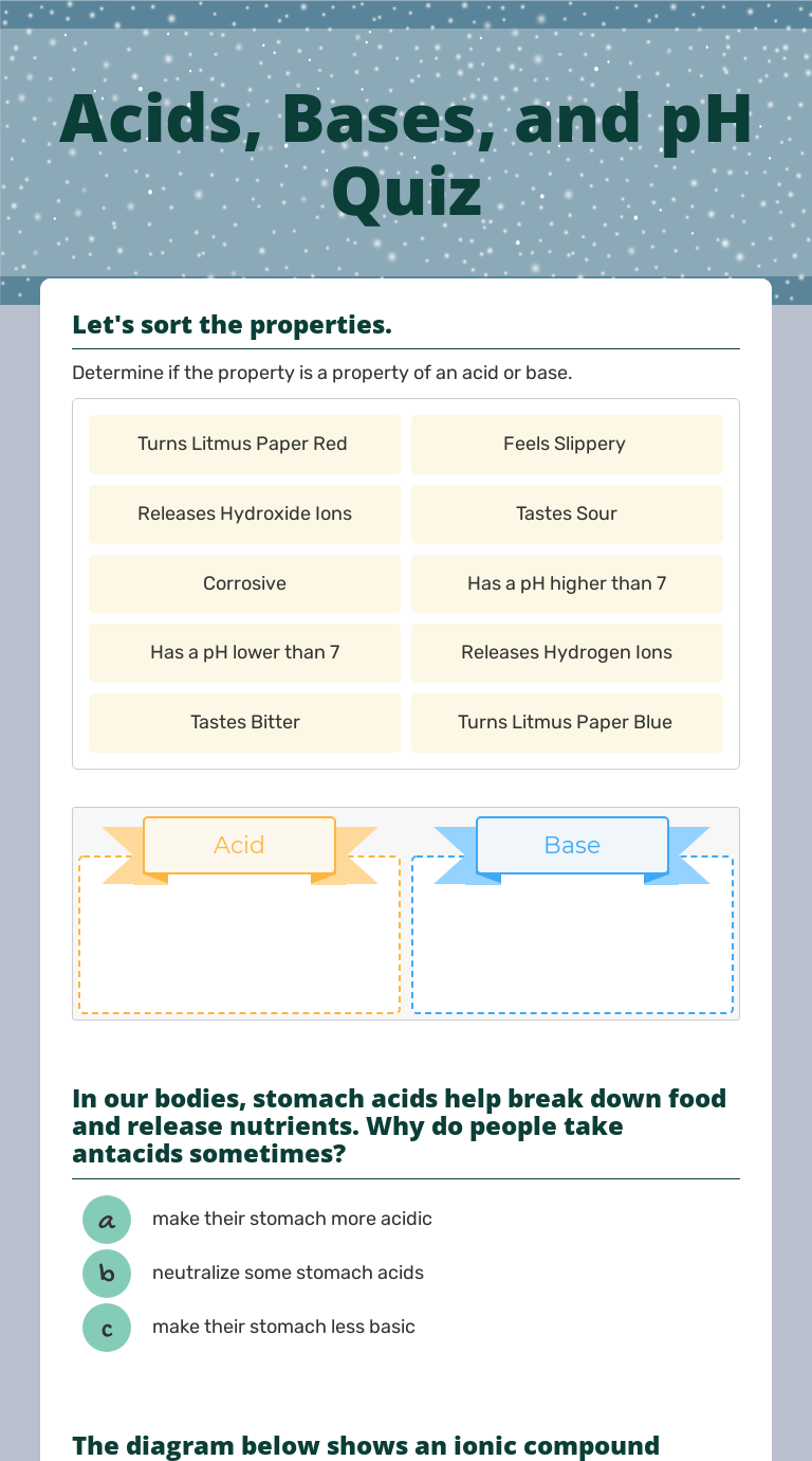 Acids, Bases, and pH Quiz Interactive Worksheet by MaryAnn Holderman