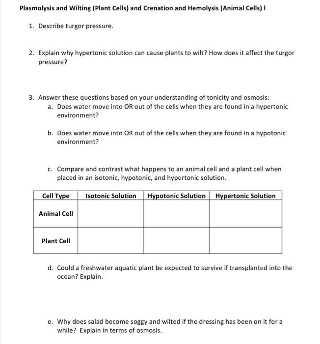 Solved Cell Homeostasis Virtual Lab Fill in the table with