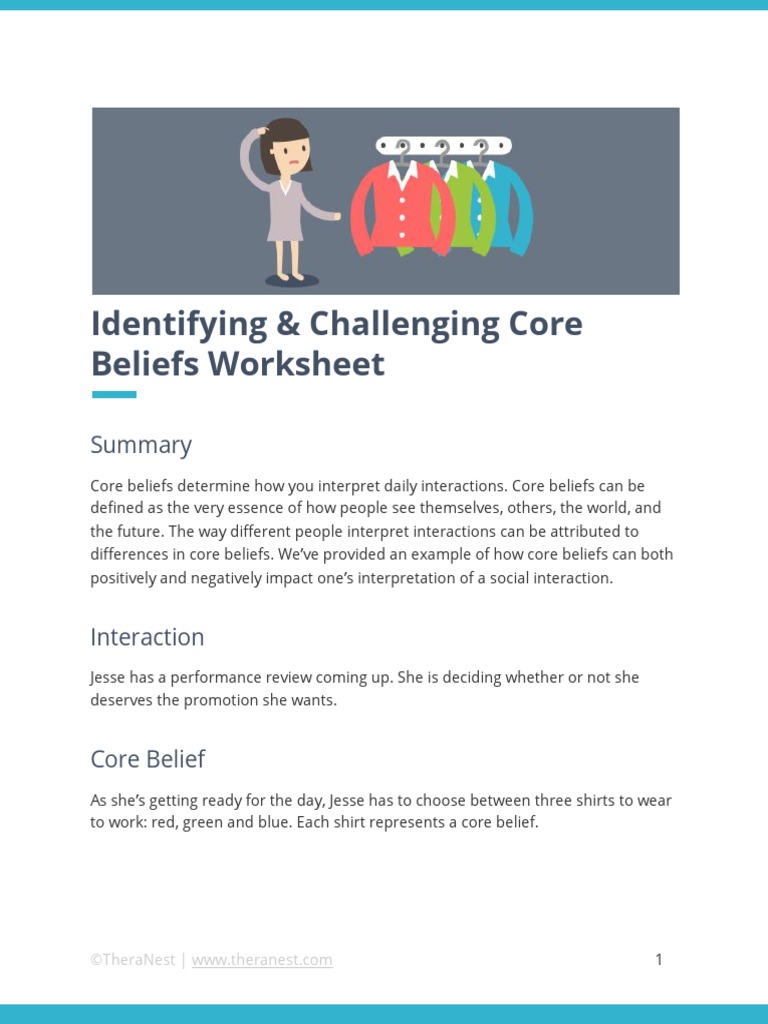 Core beliefs can be defined as the very essence of how people see themselves,. Challenging these negative core beliefs can help clients develop a healthier understanding of themselves and the world around them. Examining the evidence worksheet will help clients review the evidence for and against their core beliefs, including. Core beliefs determine how you interpret daily interactions. Challenging questions.