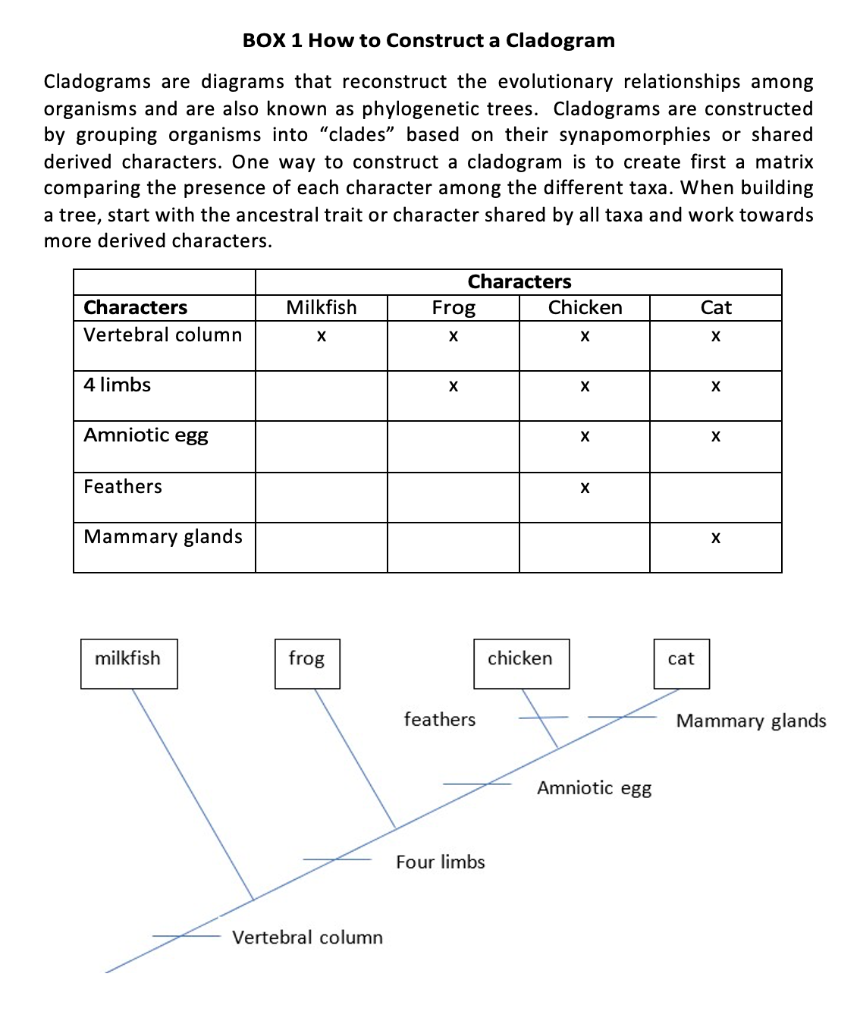 Mark an “x” if an organism has the trait. Use the following cladogram to answer the questions below. Mark an “x” if an organism has the trait. Add each of these organisms to the cladogram below: In the box below, create a cladogram based off your matrix.