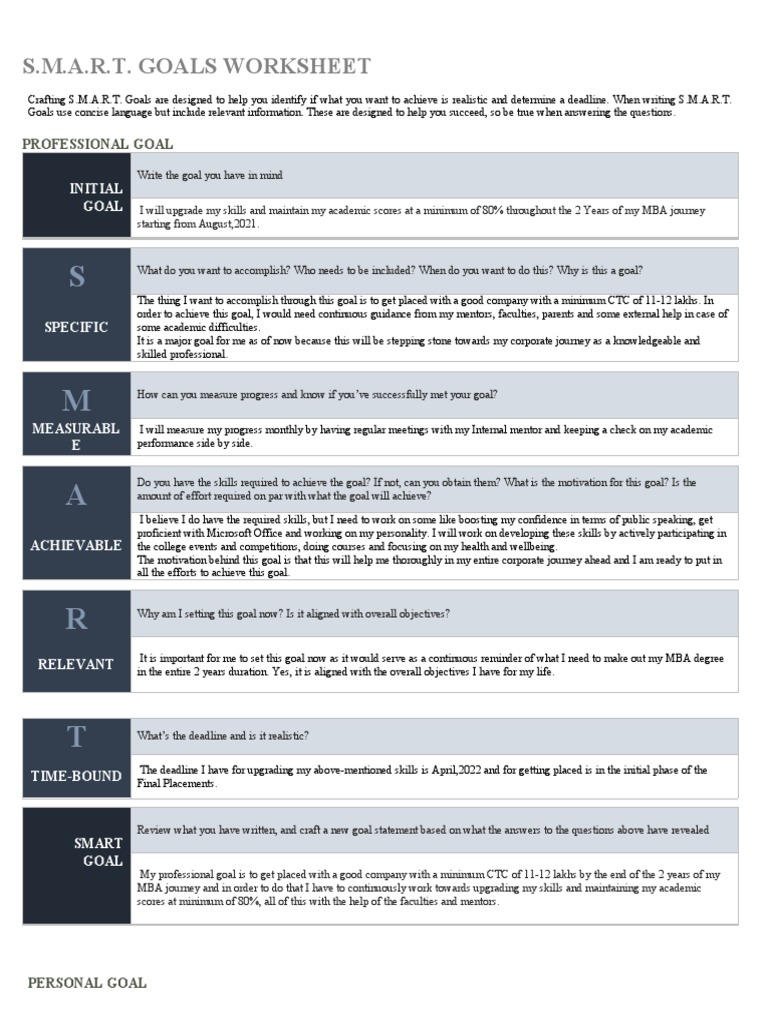 Your goal should be clear and precise, otherwise you will not be able to focus your efforts or feel. Goals are designed to help you identify if what you want to achieve is realistic and determine a deadline. Use the worksheet to set smart goals. How can you measure progress or success? Goals are designed to help you identify if.
