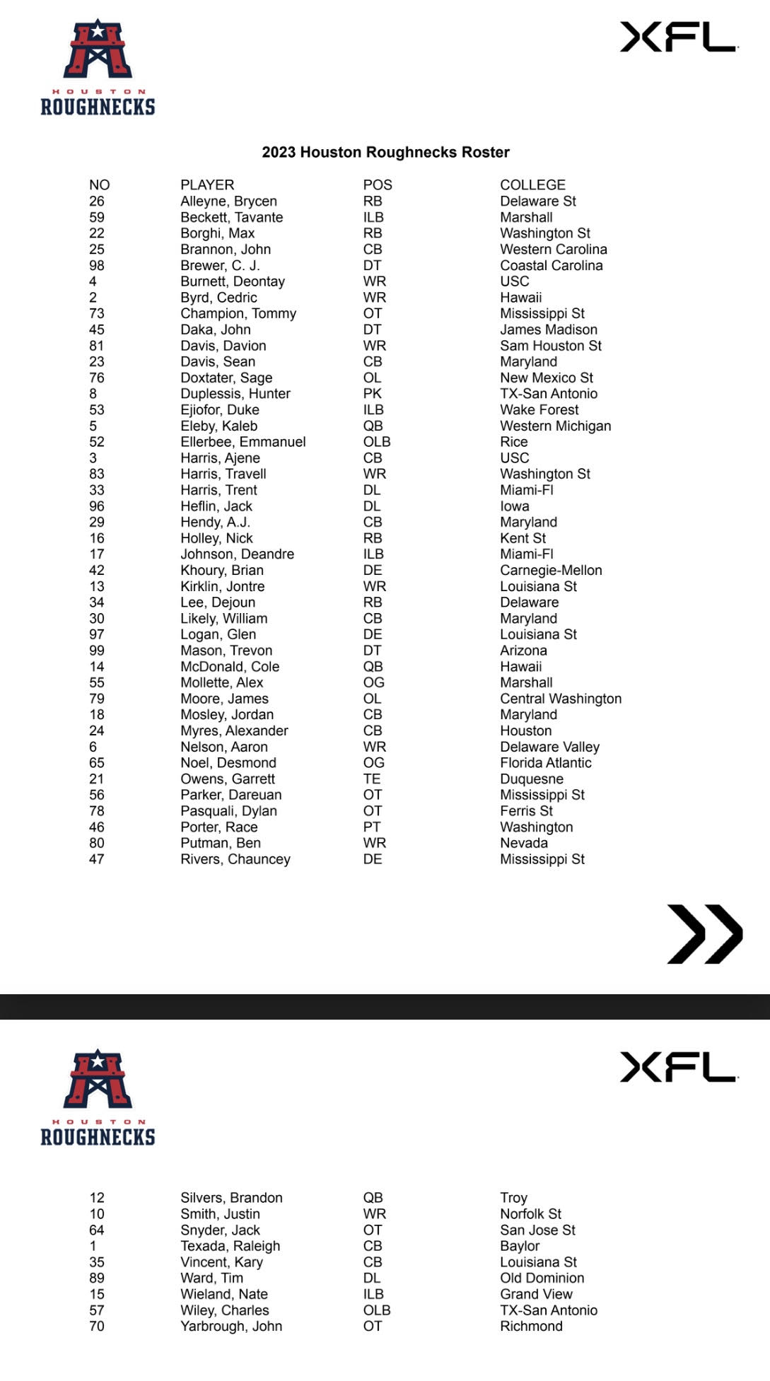 Explore the ufl houston roughnecks player roster for the current football season. The most accurate, up to date ufl depth charts and rosters on the net for reality football, fantasy owners and fans. Careers opens in a new. Shop opens in a new window ; Houston roughnecks roster for the 2025 ufl season.