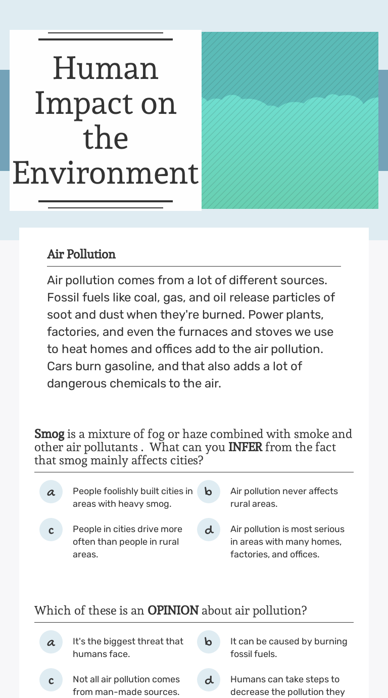 Showing 8 worksheets for human impact on the environment. Worksheets are human impact on the environment, humans cause. Showing 8 worksheets for human impacts on the environment. Communities have attempted to control the size of mosquito populations to prevent the spread. Humans have altered the face of the earth more than any other species, and the pace of change.