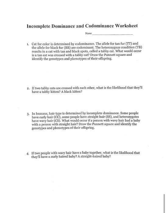 Incomplete And Codominance Worksheet With Answers - Cat fur color is determined by codominance. The allele for tan fur (tt) and the allele for black fur (bb) are codominant.