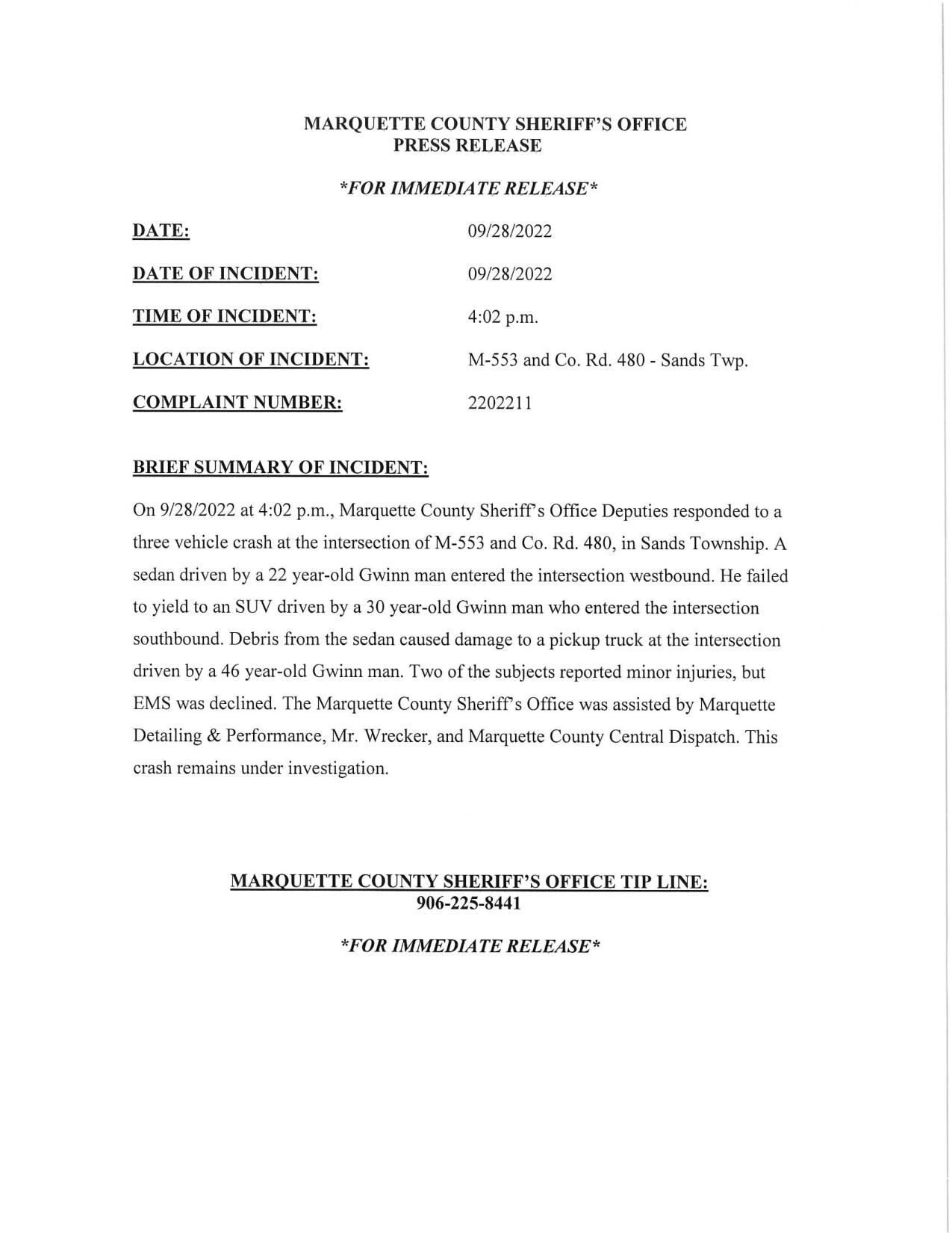 Minor Injuries Reported In Traffic Crash In Marquette County