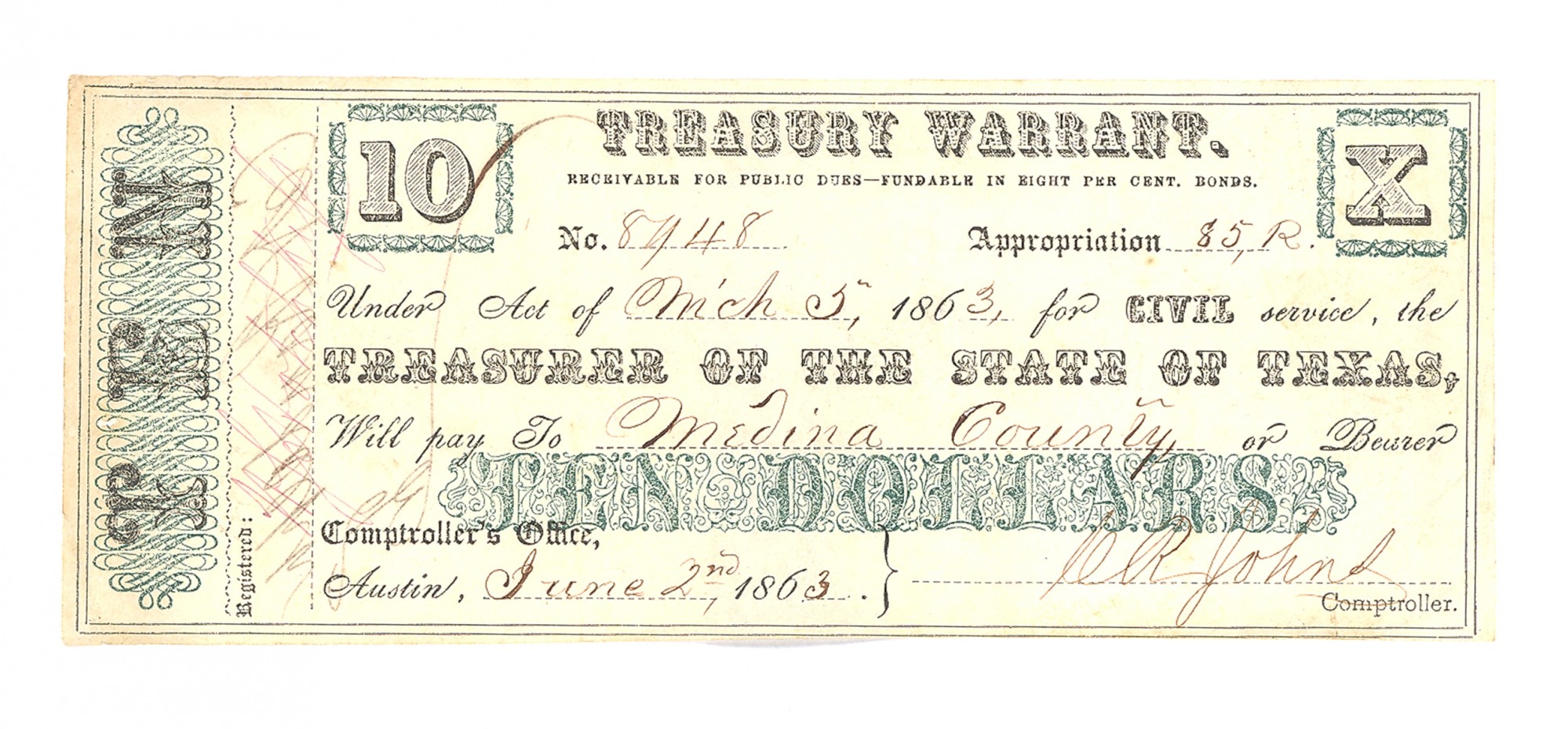 TEXAS CIVIL TREASURY WARRANT, MEDINA COUNTY, TEXAS 10 NOTE — Horse Soldier