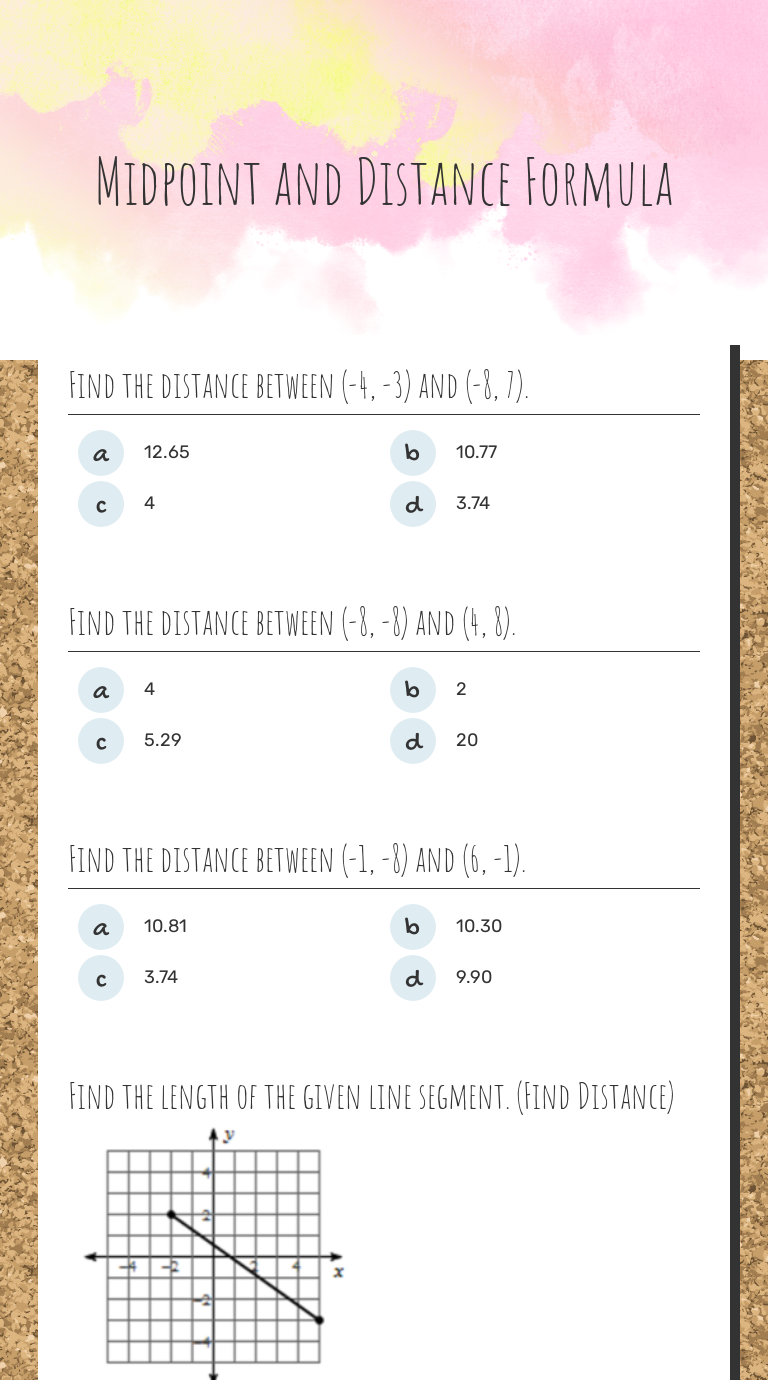 Slope, distance, and midpoint formulas answer these problems, then check your answers using the key on the next page. Distance formula and pythagorean theorem example: The distance between (3, 4) and (x, 7) is 5 units.