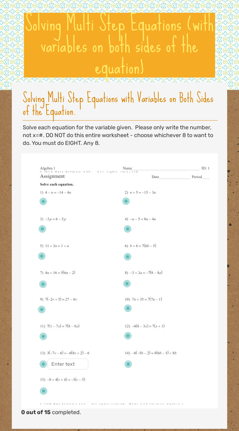 Free trial available at kutasoftware.com. Math monks solving equations with variables on both sides solve each equation. Perform any distributive property shown in the equation. Combine any like terms in the equation (do not.