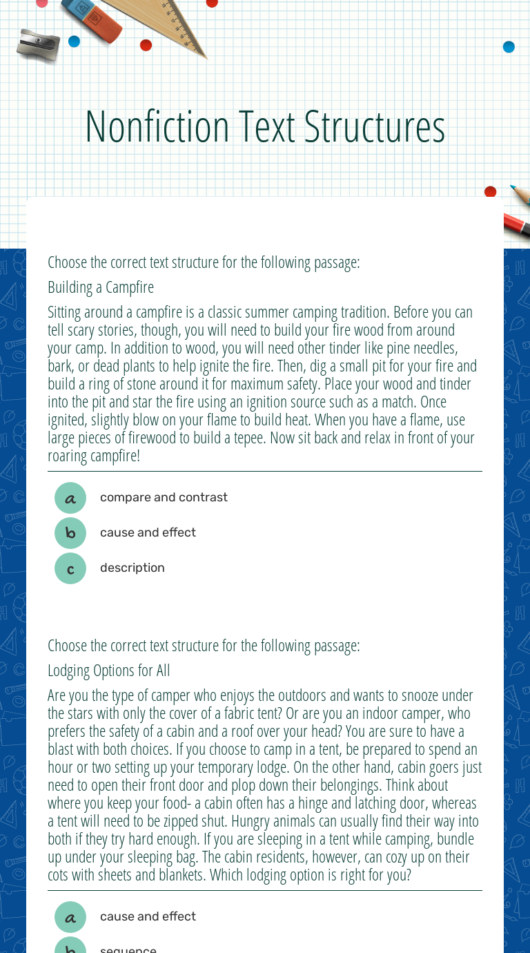 In this text structure worksheet, students will read five nonfiction passages about the american war for independence. Worksheets are non fiction unit, resources for text structure, nonfiction text. Worksheets are non fiction unit, resources for text structure, nonfiction text. Showing 8 worksheets for nonfiction text structures. Our text structure worksheets offer an essential resource for educators, parents, and students seeking.