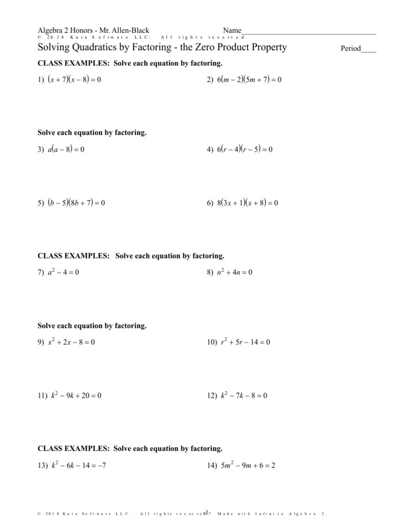 Solving Quadratic Equations Using The Zero Product Property Worksheet