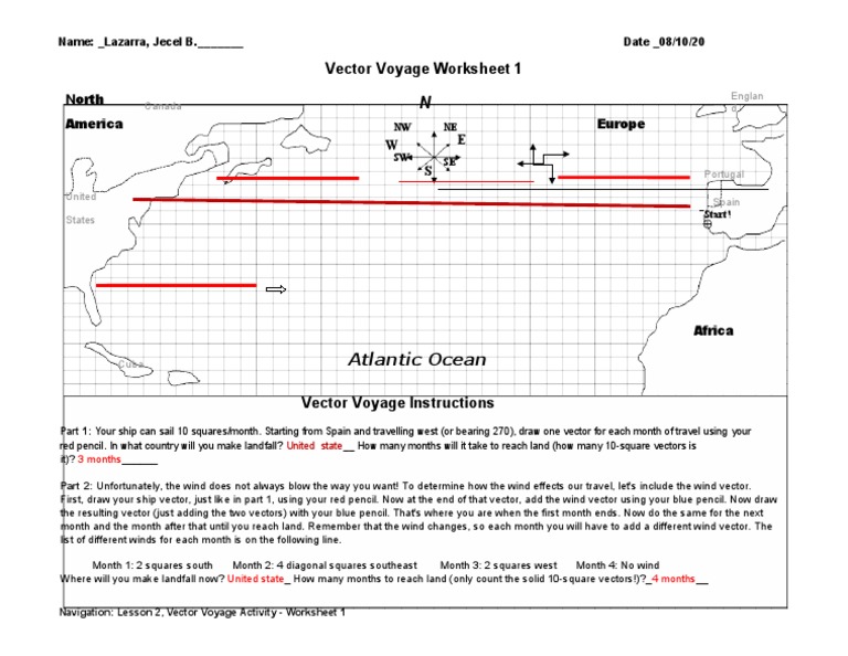 Starting from spain and travelling west (or bearing 270), draw one vector for each month of travel. Remember that the wind changes, so each month you will have to add a different ind vector. The list of different winds for each. Your ship can sail 10 squares/month. Learn how to use vectors to plot a course and correct for wind and current using dead reckoning. This activity is for grade 8 students and. A solution worksheet for a vector voyage activity that involves sailing from spain to north america or europe. It shows the vectors, landfall.