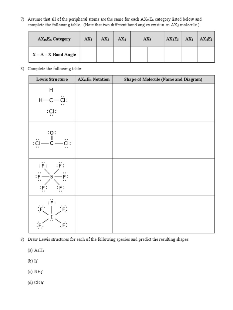 Vsepr Theory Worksheet Fill In The Boxes For Each Of The Following.