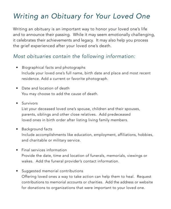 When you write your own obituary, you get the last word. Your loved ones, meanwhile, get a lasting. Find free templates for writing an obituary, with examples and tips.